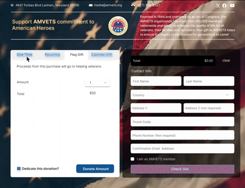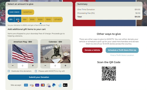 After the donation page was finished, I was delighted to see that the AMVETS team had not only changed the visuals, but improved upon my solution. They removed the tabs on the donation screen and placed additional donation rewards on the same section as the dollar donation, streamlining navigation further. They also iterated on check-out info, tallying them up neatly. Even though this was a team effort, I was given credit for providing AMVETS with the design they were looking for.
