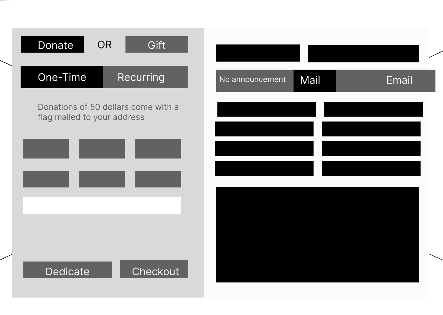 My first task was to conceptualize how the donation process would work. I opted for 2 windows: the first would display the donation options, and the second would display the payment method. I chose this design to reduce scrolling that would add tedium for the user if they decided to go back and make changes to their donation.