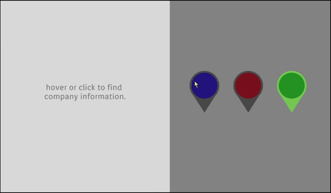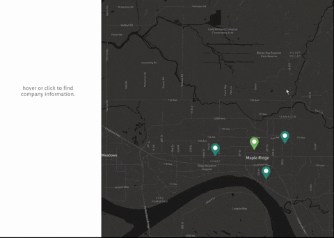The CEO rejected my idea. She clarified that she wanted to emphasize the business that had partnered with Ridge Meadows Chamber of Commerce. To this end, I added a clicking interaction that would highlight the location cursors on the map. The chamber would have a golden highlight distinguishing it from the rest of the cursors. In addition, registered businesses would have an emblem under them, marking them as a partner of the chamber.