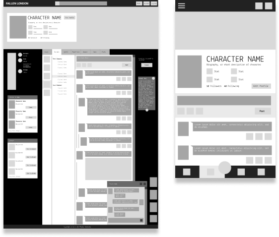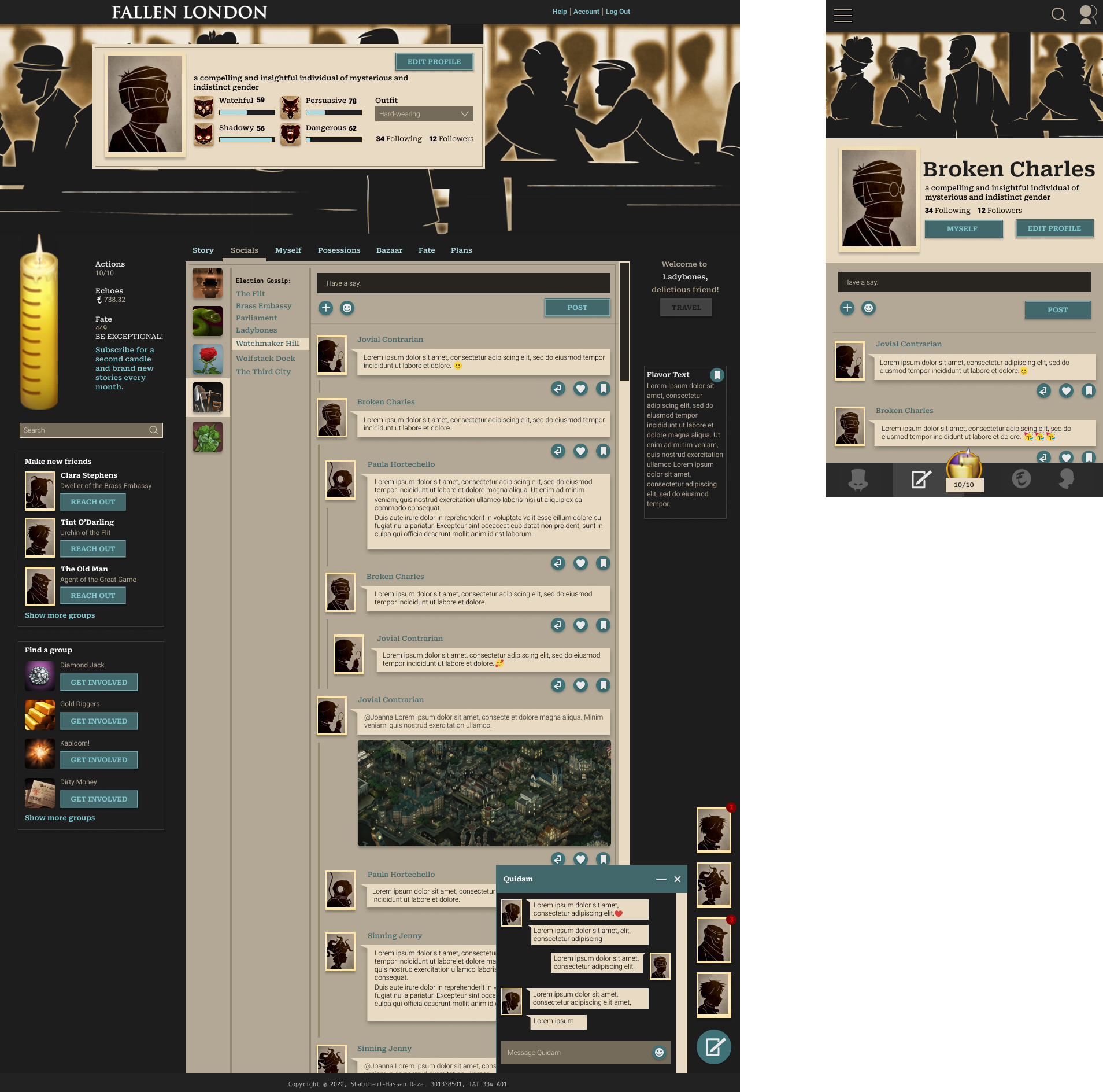 I showed off my prototypes to Fallen London fans in various social media communities. Many people were of the opinion that Fallen London deserved to have some sort of social media feature and this was a good direction towards it. This project was a fun excuse to check out UX trends in various social media and I had a really good time making it.