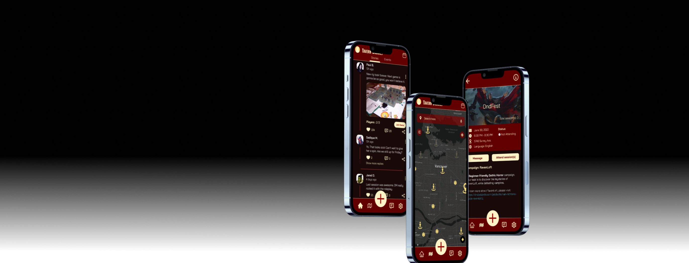 The team decided to go against the grain when coming up with what the visuals of Tavern Buddies would later become. It was a goal for Tavern Buddies to stand out from the more subdued color schemes of websites like facebook or twitter. The color palette was inspired by the colors that Wizards of the Coast (the proprietors is DnD) used in the books they publish. Red with gold trims gave the app a subdued regal look that distinguished it from other apps.